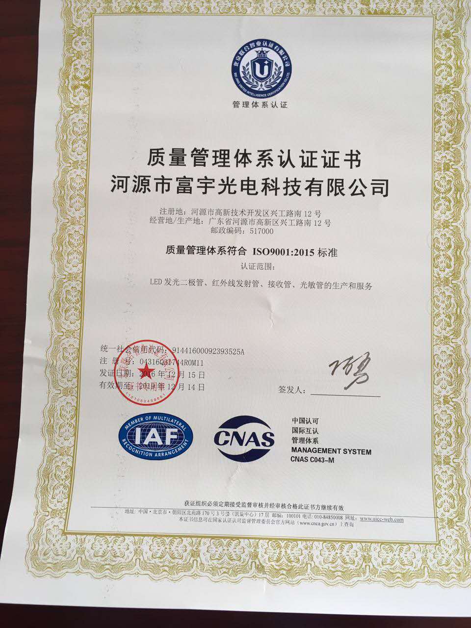ISO9001:2015認(rèn)證證書